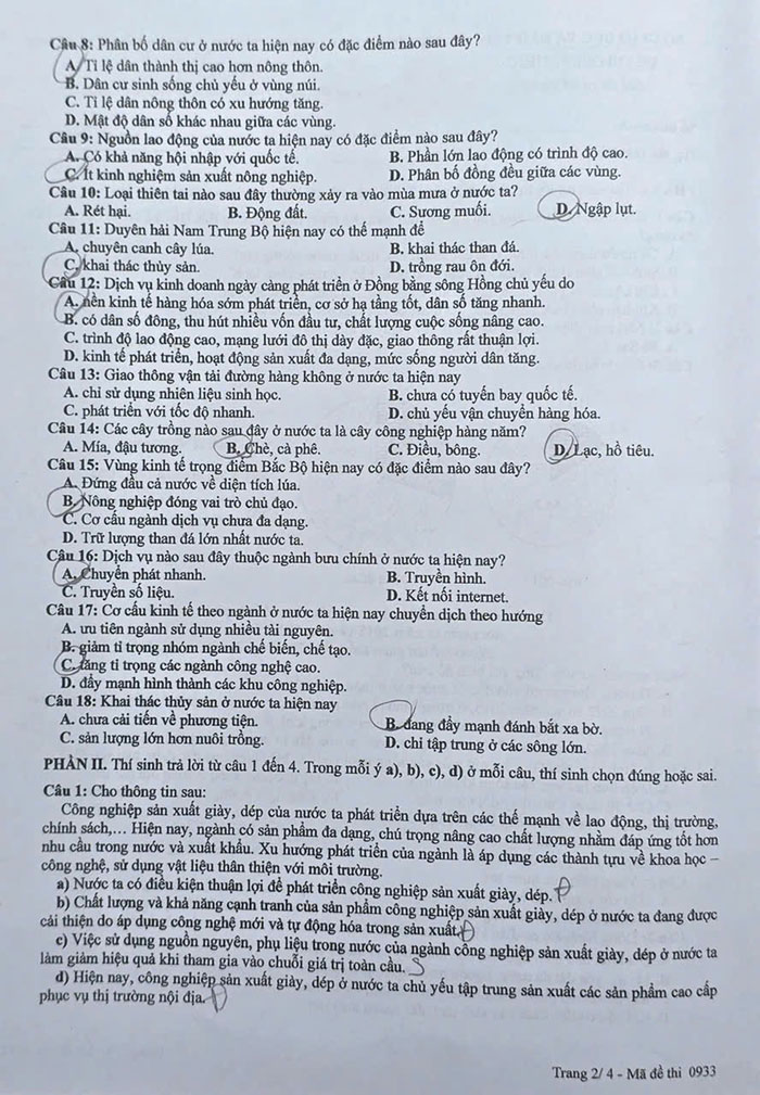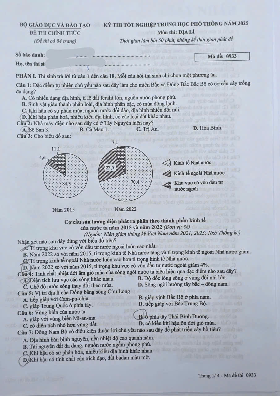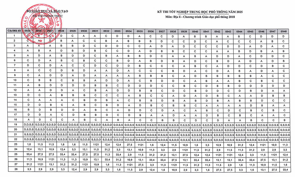Đề thi Địa lý THPT Quốc gia 2025 có cấu trúc hoàn toàn mới gồm 28 câu hỏi với 3 phần: 18 câu hỏi ở dạng thức trắc nghiệm nhiều lựa chọn cho 04 phương án chọn 01 đáp án đúng; 04 câu hỏi ở dạng thức trắc nghiệm dạng Đúng/Sai, 06 câu hỏi ở dạng thức trắc nghiệm dạng trả lời ngắn. Vậy dưới đây là toàn bộ đáp án đề thi Địa lý THPT Quốc gia 2025 mời các bạn cùng theo dõi nhé. Ngoài ra, có thể tham khảo thêm Đáp án đề thi THPT Quốc gia 2025 với đầy đủ các môn.