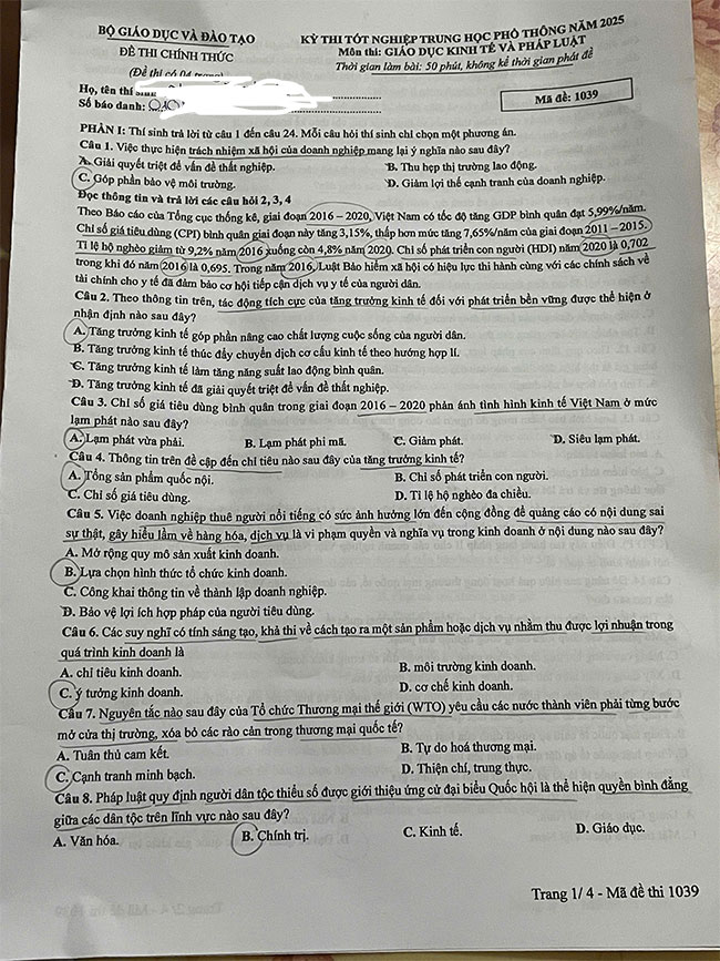 Đáp án đề thi THPT Quốc gia 2025 môn Giáo dục Kinh tế và Pháp luật của Bộ GD&ĐT Đề thi chính thức môn GDKT&PL 2025