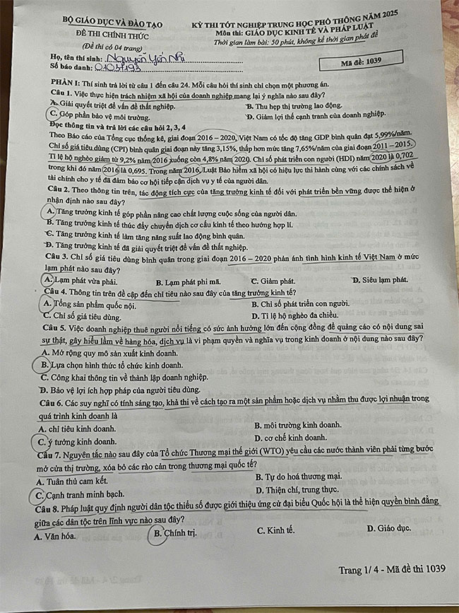 Đáp án Giáo dục Kinh tế và Pháp luật THPT Quốc gia 2025 của Bộ GD&ĐT