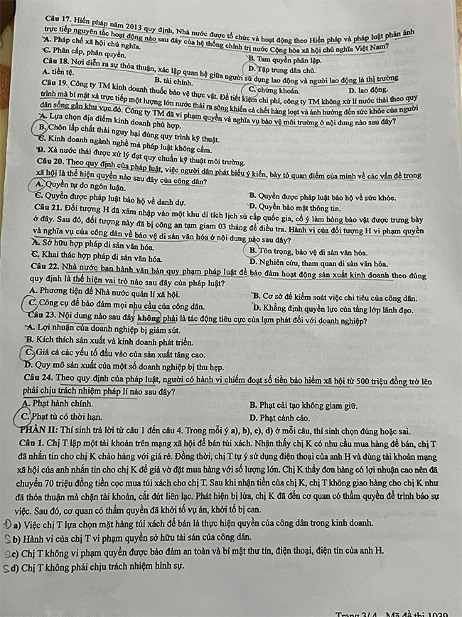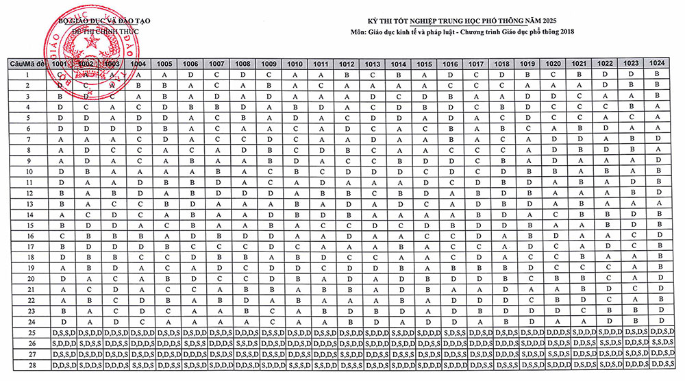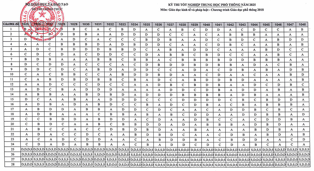 Đáp án Giáo dục Kinh tế và Pháp luật THPT Quốc gia 2025 nhanh, chính xác nhất giúp các em học sinh dễ dàng đối chiếu với kết quả bài làm của mình được thuận tiện hơn.
