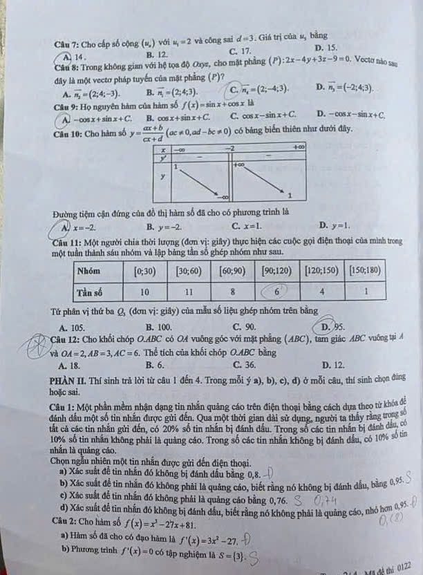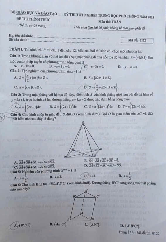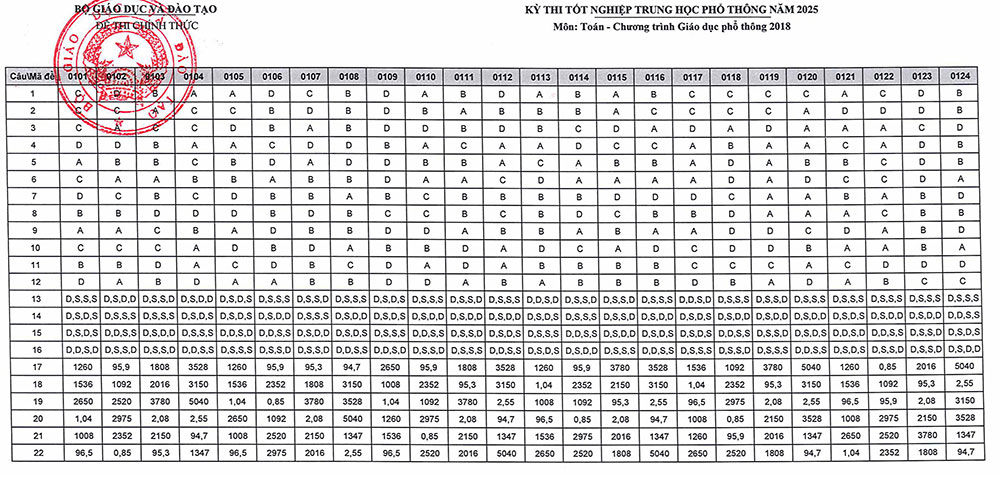 Đề thi Toán THPT Quốc gia 2025 có cấu trúc hoàn toàn mới gồm 22 câu hỏi: 12 câu hỏi ở dạng thức trắc nghiệm nhiều lựa chọn cho 04 phương án chọn 01 đáp án đúng; 04 câu hỏi ở dạng thức trắc nghiệm dạng Đúng/Sai, 06 câu hỏi ở dạng thức trắc nghiệm dạng trả lời ngắn. Vậy dưới đây là toàn bộ đáp án đề thi Toán THPT Quốc gia 2025 mời các bạn cùng theo dõi nhé. Ngoài ra, có thể tham khảo thêm Đáp án đề thi THPT Quốc gia 2025 với đầy đủ các môn.