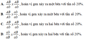 Câu 5: Khi giao phấn giữa hai cây cùng loài, người ta thu được F1 có tỉ lệ như sau: 70% thân cao, quả tròn: 20% thân thấp, quả bầu dục: 5% thân cao, quả bầu dụ : 5% thân thấp, quả tròn. Kiểu gen của P và tần số hoán vị gen là: