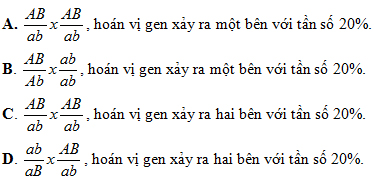 Câu 5: Khi giao phấn giữa hai cây cùng loài, người ta thu được F1 có tỉ lệ như sau: 70% thân cao, quả tròn : 20% thân thấp, quả bầu dục : 5% thân cao, quả bầu dục : 5% thân thấp, quả tròn. Kiểu gen của P và tần số hoán vị gen là: