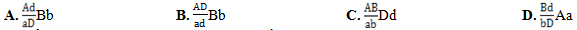 Câu 41: Ở một loài thực vật, gen A quy định thân cao, alen a quy định thân thấp; gen B quy định quả màu đỏ, alen b quy định quả màu xanh; gen D quy định quả tròn, alen d quy định quả bầu. Biết rằng các gen trội là trội hoàn toàn. Cho giao phấn cây thân cao, quả màu đỏ, tròn với cây thân thấp, quả màu xanh, bầu thu được F1 toàn kiểu hình thân cao, quả đỏ, tròn. Cho F1 tự thụ phấn được F2 gồm 56,25% cây thân cao, quả màu đỏ, tròn; 18,75% cây thân cao, quả màu xanh, bầu; 18,75% cây thân thấp, quả màu đỏ, tròn; 6,25% cây thân thấp, quả màu xanh, bầu. Kiểu gen của cây F1 phù hợp với phép lai trên là: