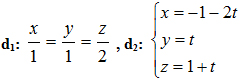 2. Cho hai đường thẳng và mặt phẳng (P): x – y – z = 0. Tìm tọa độ hai điểm M thuộc d1, N thuộc d2 sao cho MN song song (P) và MN =