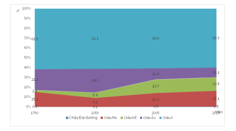 Câu 5: Cho biểu đồ thể hiện sự thay đổi cơ cấu dân số thế giới phân theo các châu lục giai đoạn 1750-2015
