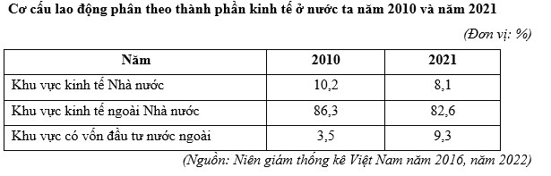 Theo bảng số liệu, nhận xét nào đúng về cơ cấu lao động phân theo thành phần kinh tế nước ta năm 2021 so với năm 2010?