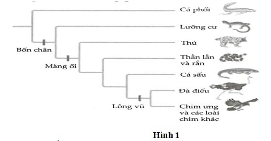 Câu 6. Dựa trên các số liệu giải phẫu và phân tích trình tự DNA, người ta đã xây dựng được cây tiến hóa phản ánh mối quan hệ họ hàng giữa các loài như Hình 1 sau: