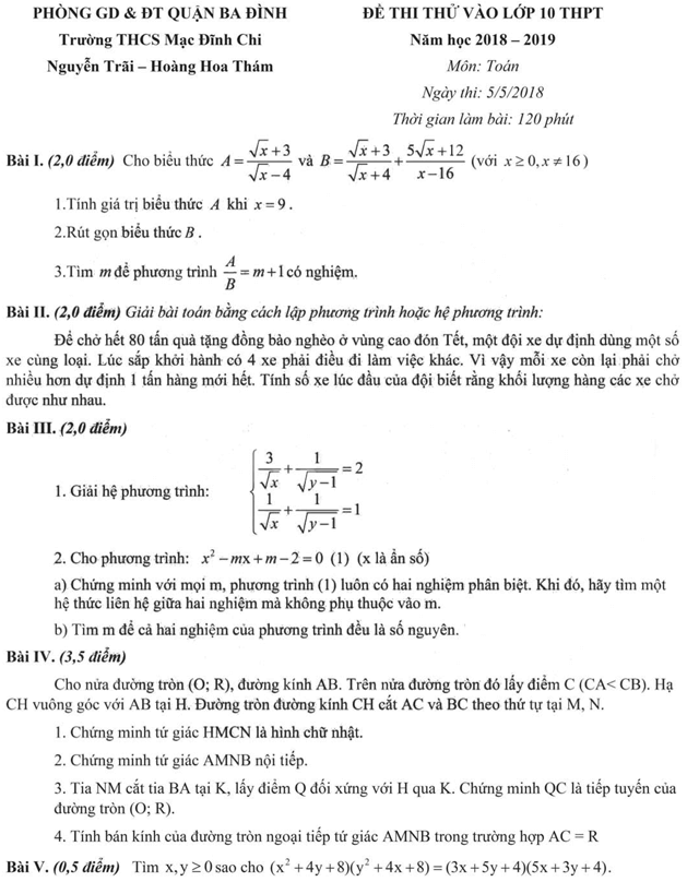 Đề thi thử vào lớp 10 môn Toán năm học 2018 - 2019 trường THCS Mạc Đĩnh Chi, Hà Nội Đề thi minh họa vào lớp 10 môn Toán có đáp án