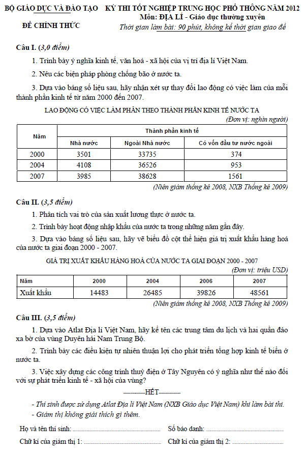 Đề thi tốt nghiệp THPT môn Địa lí hệ Giáo dục thường xuyên năm 2012 Đề thi TN THPT môn Địa