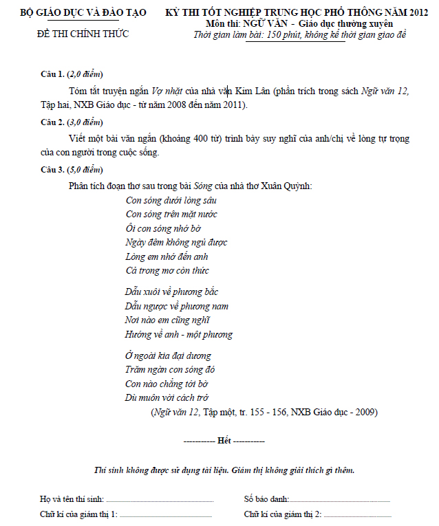Tìm hiểu thêm »Đề thi tốt nghiệp THPT môn Ngữ Văn dành cho hệ Giáo dục thường xuyên năm học 2012
