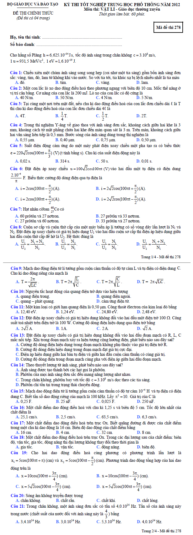 Đề thi tốt nghiệp THPT môn Vật Lí hệ Giáo dục thường xuyên 2012 - Mã đề 278 Đề thi TN THPT môn Vật lí