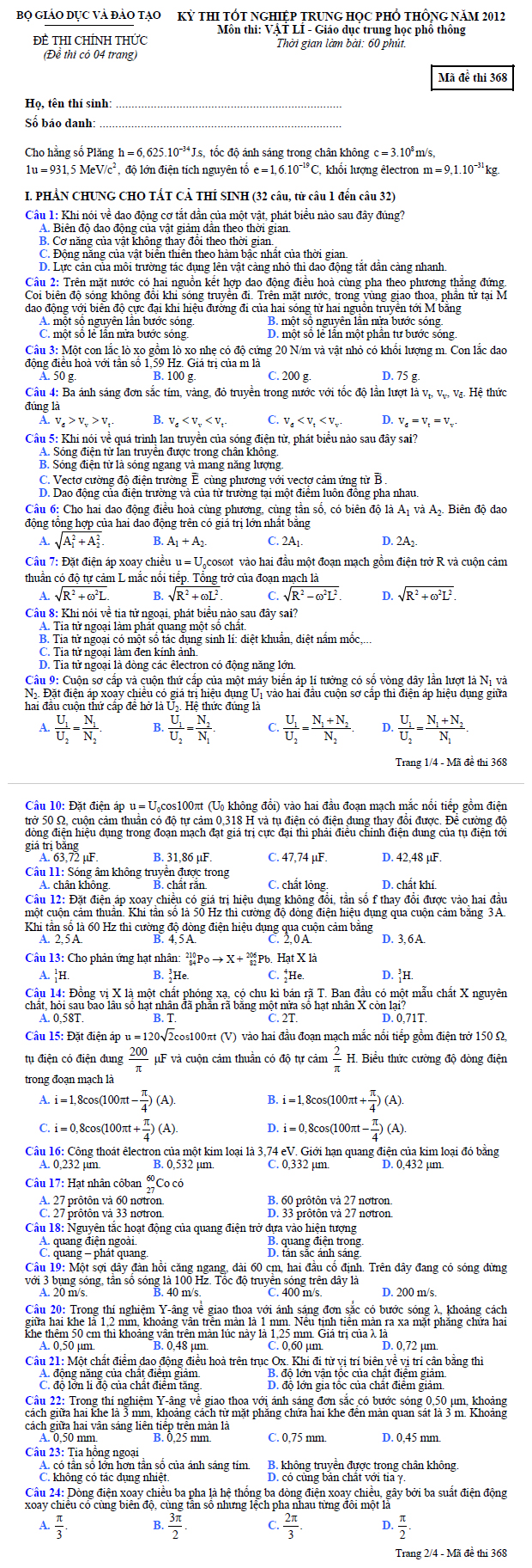 Đề thi tốt nghiệp THPT môn Vật Lí hệ Phổ thông 2012 - Mã đề 368 Đề thi TN THPT môn Vật lí