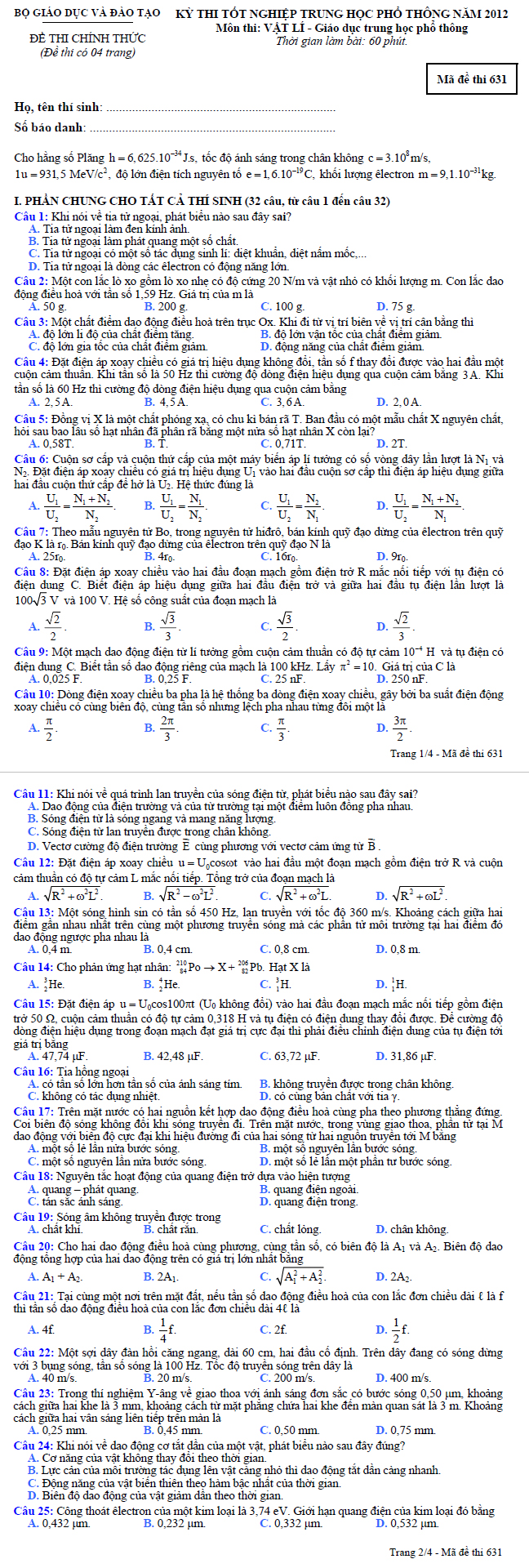 Tìm hiểu thêm »Đề thi tốt nghiệp THPT môn Vật lí hệ Phổ thông theo hình thức trắc nghiệm - Mã đề 631