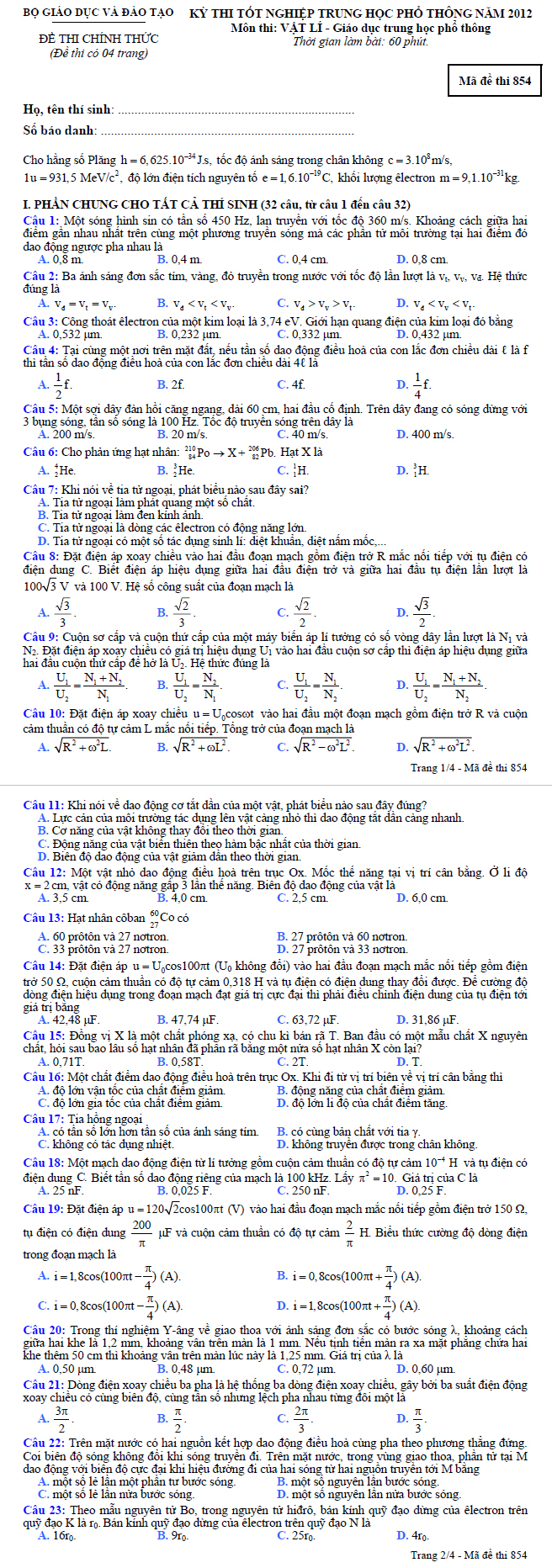 Tìm hiểu thêm »Đề thi tốt nghiệp THPT môn Vật lí hệ Phổ thông theo hình thức trắc nghiệm - Mã đề 854