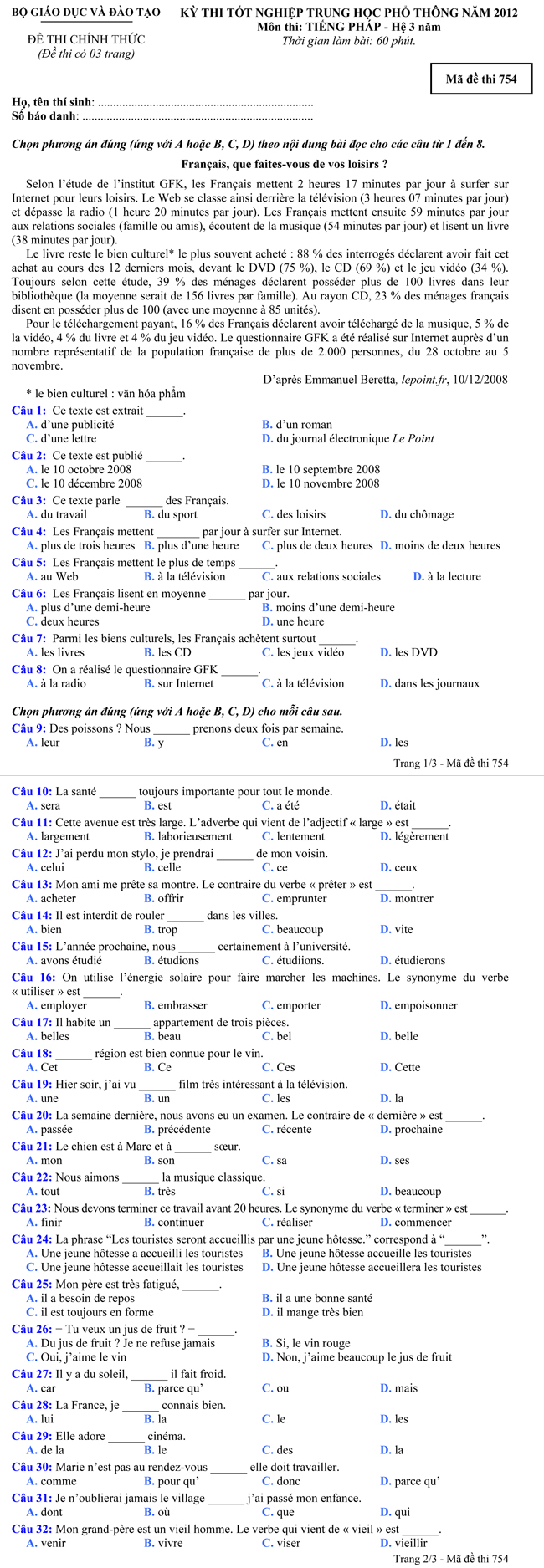 Tìm hiểu thêm »Đề thi tốt nghiệp THPT tiếng Pháp năm 2012 theo hình thức trắc nghiệm dành cho hệ Phổ thông 3 năm - Mã đề thi 754