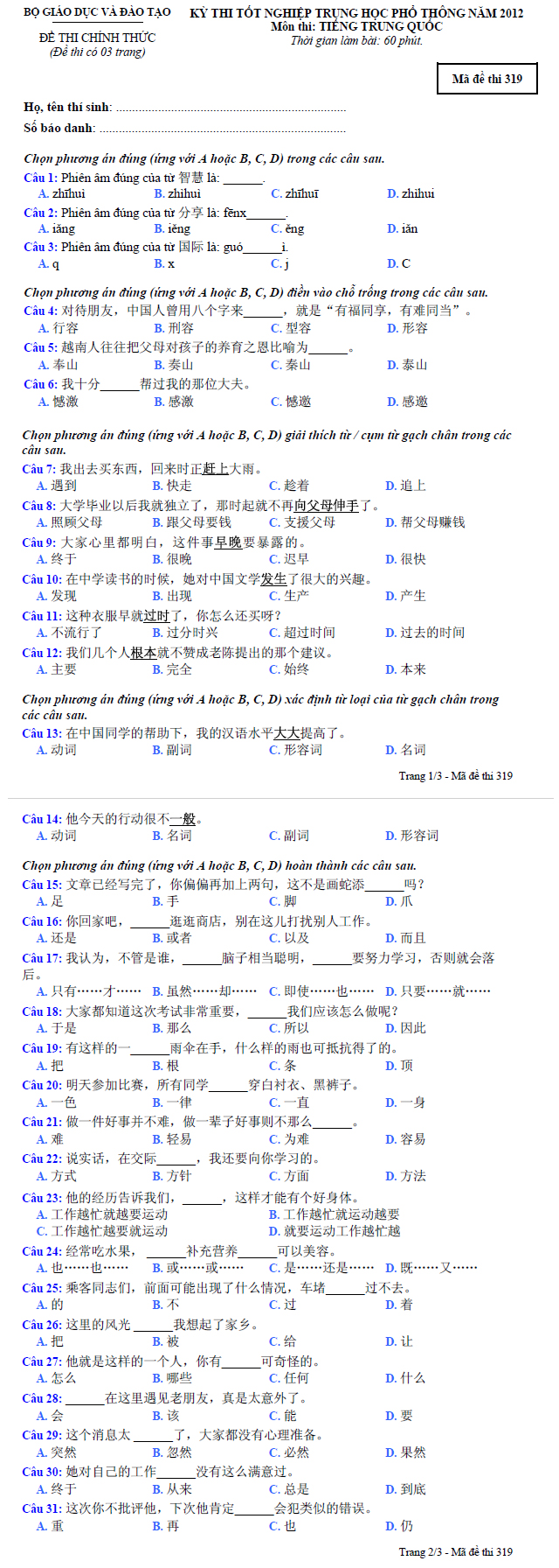 Đề thi tốt nghiệp THPT tiếng Trung hệ Phổ thông năm học 2012 - Mã đề thi 319