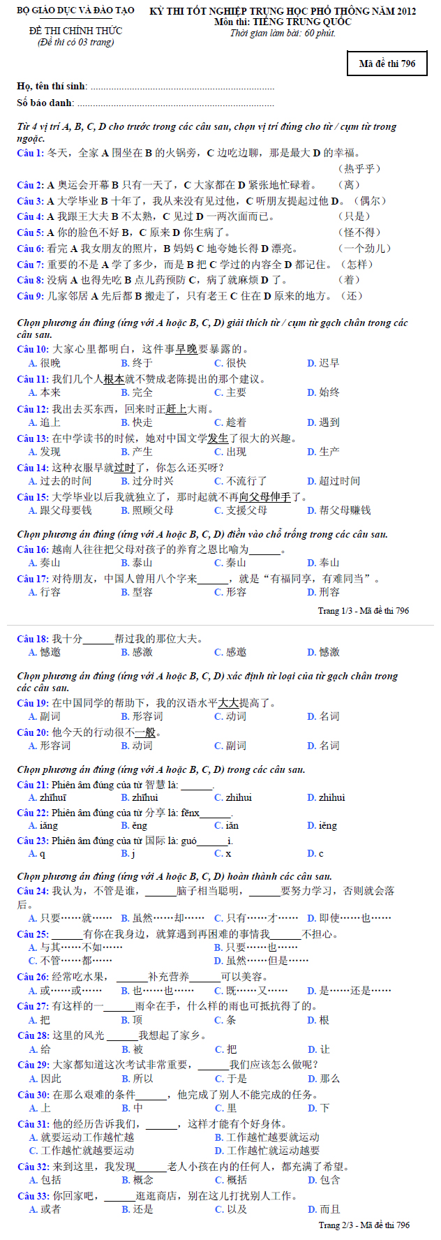 Tìm hiểu thêm »Đề thi tốt nghiệp THPT tiếng Trung hệ Phổ thông năm học 2012 - Mã đề thi 796