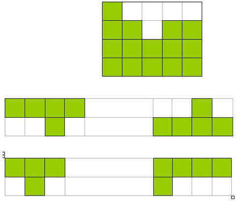 Câu 2: Hình chữ nhật dưới đây bị thiếu 1 miếng. Miếng nào trong số các miếng ở dưới có thể ghép kín phần bị thiếu? Hãy khoanh tròn miếng ghép đó.