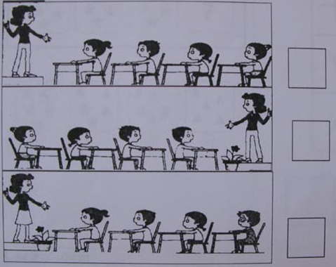 Giáo viên hướng dẫn: Hãy quan sát 3 hình vẽ 3 lớp học ở câu 1 trong 10 giây. Cô giáo của Mai không mặc váy, Lớp của Mai không có chậu hoa. Hãy đánh dấu X vào ô trống cạnh lớp học của Mai.