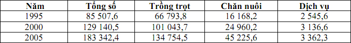 a. Vẽ biểu đồ thích hợp nhất để thể hiện quy mô, cơ cấu giá trị sản xuất nông nghiệp phân theo ngành của nước ta trong các năm 1995, 2000 và 2005 theo bảng số liệu trên.
