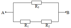 Cho 3 điện trở R1, R2 và R3, R3 = 16 chịu được các hiệu điện thế tối đa lần lượt là U1max = U2max = 6V, U3max = 12V. Người ta ghép ba điện trở nói trên thành đoạn mạch AB như hình vẽ thì điện trở của đoạn mạch đó là RAB = 8Ω.