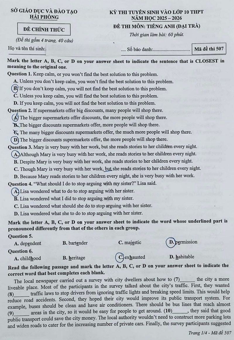 Đề thi vào 10 môn Tiếng Anh năm 2025 - 2026 sở GD&ĐT Hải Phòng Đề thi tuyển sinh lớp 10 môn Anh 2025