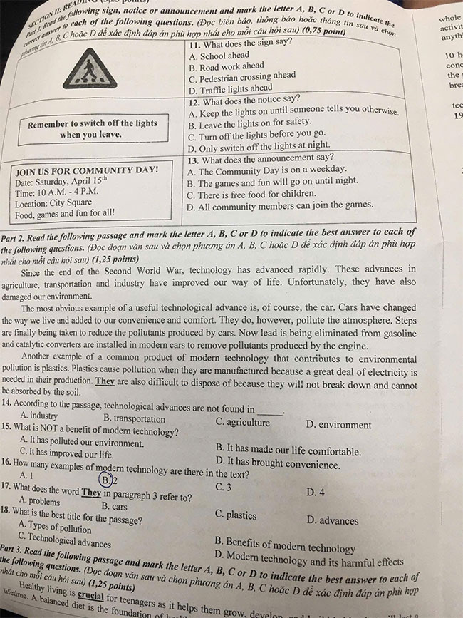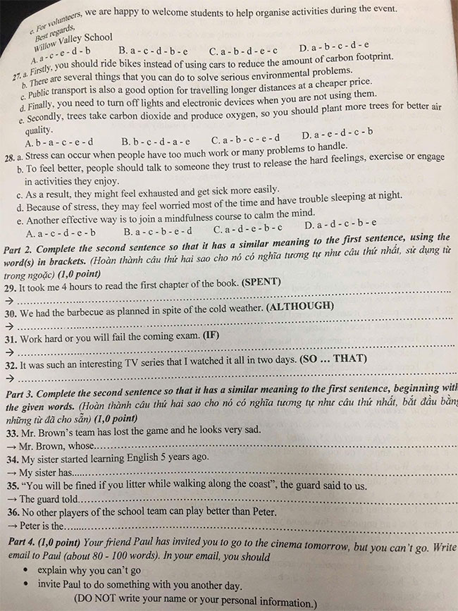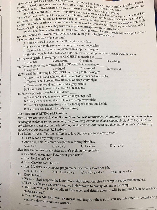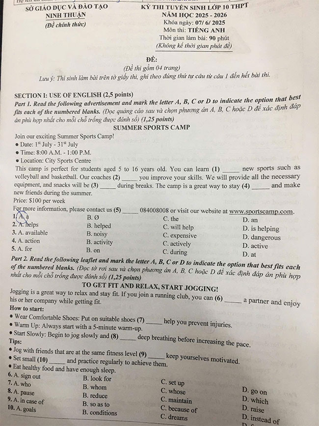 Kỳ thi tuyển sinh vào lớp 10 tại Ninh Thuận sẽ diễn ra trong hai ngày 7/6 - 8/6. Đề thi vào lớp 10 môn Tiếng Anh Ninh Thuận gồm 90 phút với cấu trúc trắc nghiệm kết hợp tự luận. Với đáp án đề thi vào 10 môn Tiếng Anh Ninh Thuận sẽ giúp các em thuận tiện so sánh đáp án với bài làm của mình. Từ đó dễ dàng nắm được số điểm mình đạt được. Vậy sau đây là nội dung chi tiết đáp án đề thi vào 10 Tiếng Anh Ninh Thuận 2025 mời các bạn cùng theo dõi nhé. Bên cạnh đó, có thể tham khảo thêm đề thi môn Văn, Toán.