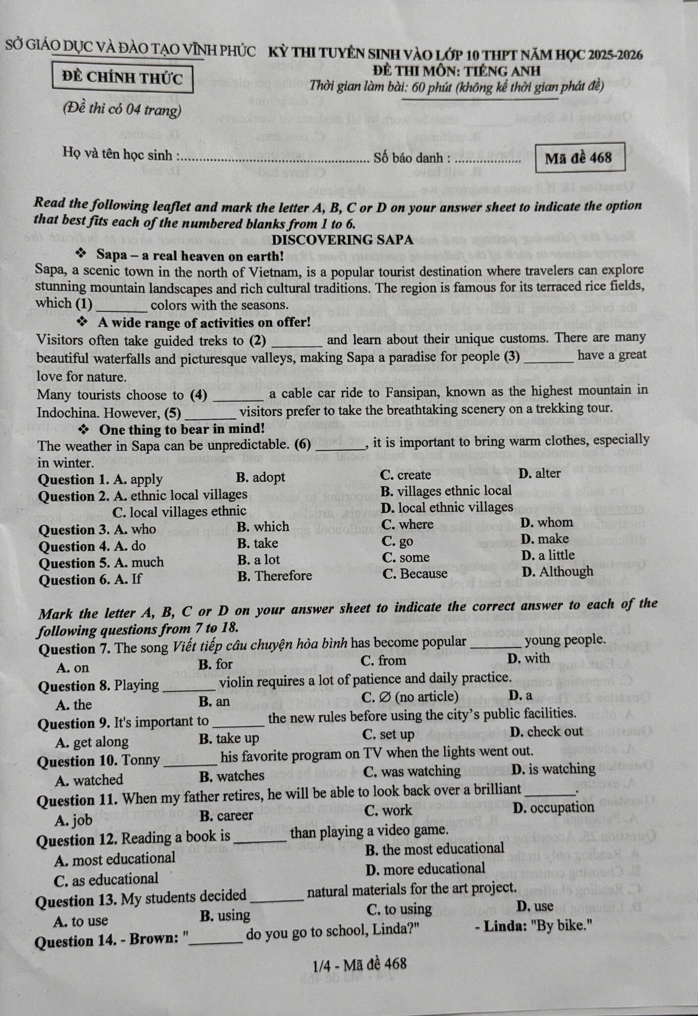 Đề thi vào 10 môn Tiếng Anh năm 2025 - 2026 sở GD&ĐT Vĩnh Phúc Đáp án đề thi vào 10 môn Anh Vĩnh Phúc 2025