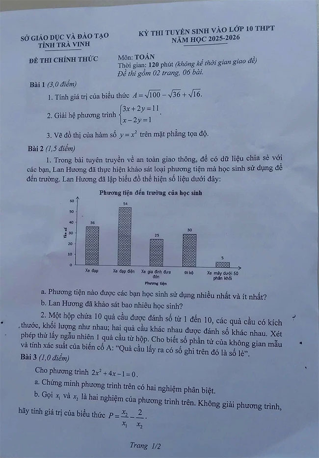 Kỳ thi tuyển sinh lớp 10 THPT năm học 2025 - 2026 trên địa bàn tỉnh Trà Vinh được tổ chức trong 2 ngày 05/06 - 06/06. Bài thi vào lớp 10 môn Toán Trà Vinh với thời gian làm bài 120 phút. Qua đáp án đề thi vào 10 môn Toán Trà Vinh giúp thí sinh và phụ huynh kiểm tra sơ bộ kết quả làm bài và tự đánh giá mức độ hoàn thành bài thi. Ngoài ra các bạn xem thêm đáp án đề thi môn Tiếng Anh, Văn.