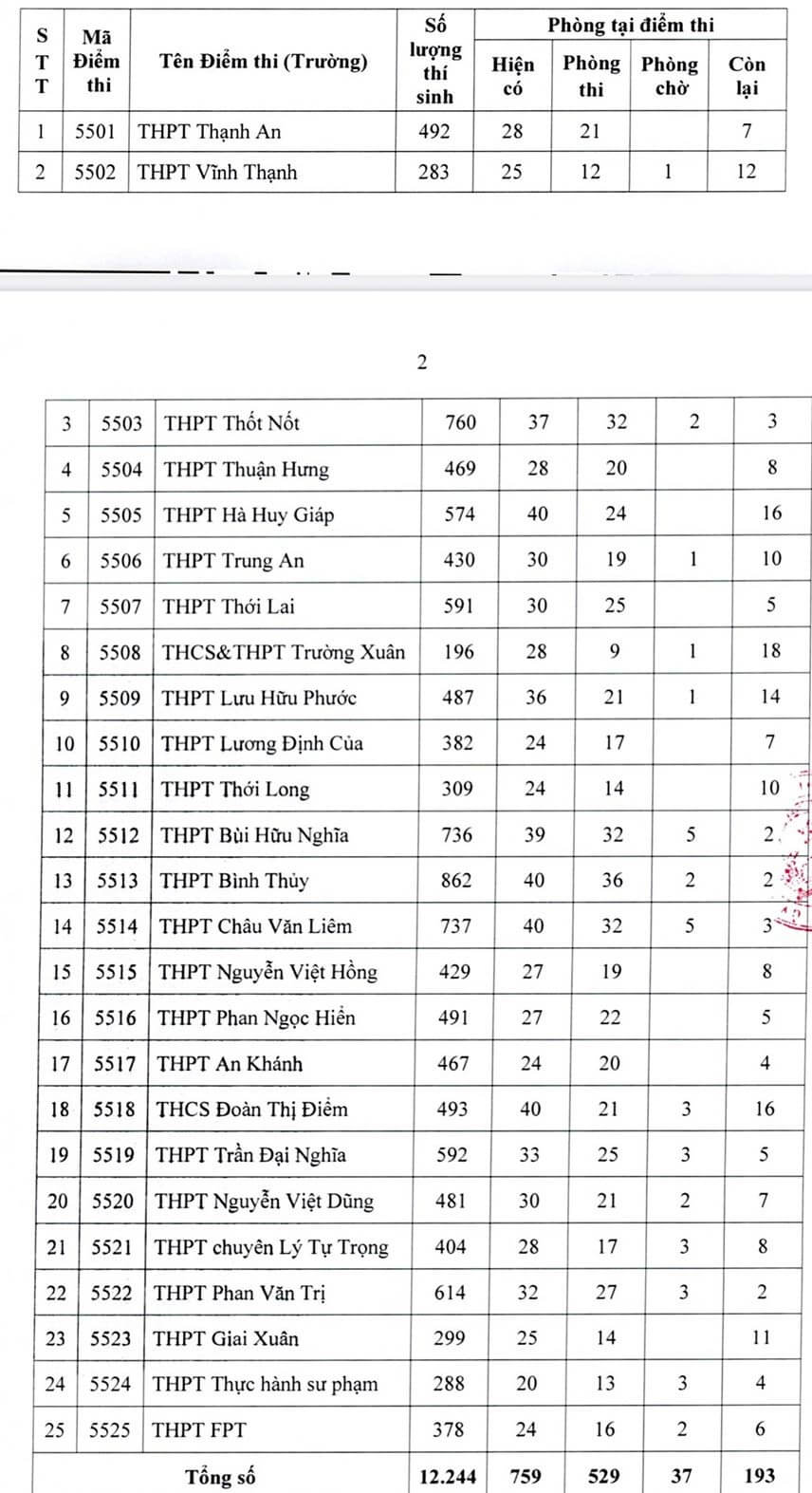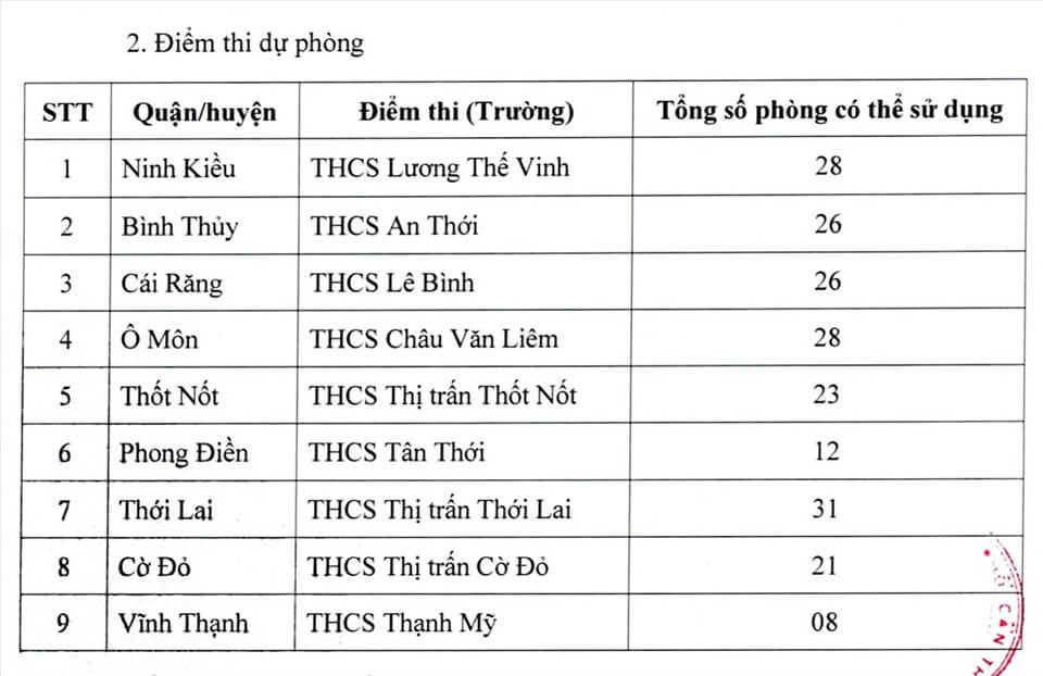 Theo đó, toàn thành phố có 25 điểm thi chính thức tại các trường THPT. Ngoài ra còn chuẩn bị 9 điểm thi dự phòng tại các trường THCS trên địa bàn 9 quận, huyện để chủ động ứng phó với dịch Covid-19. Tổng cộng Cần Thơ có 529 phòng thi tại 25 Điểm thi chính thức. Trong đó, Điểm thi lớn nhất là trường THPT Bình Thủy có 36 phòng thi, tiếp theo là trường THPT Thốt Nốt... Vậy dưới đây là danh sách 25 điểm thi tốt nghiệp THPT tại Cần Thơ, mời các bạn cùng theo dõi tại đây.