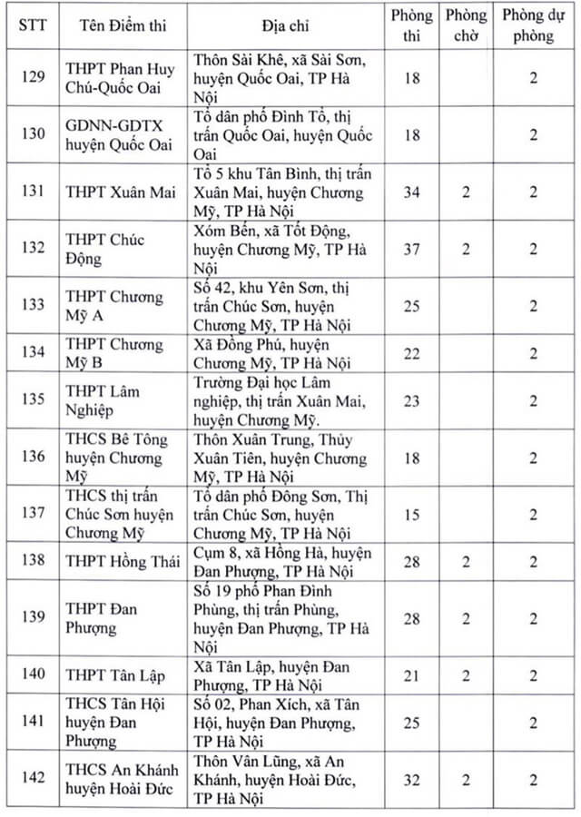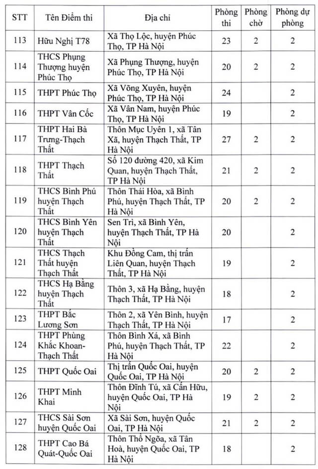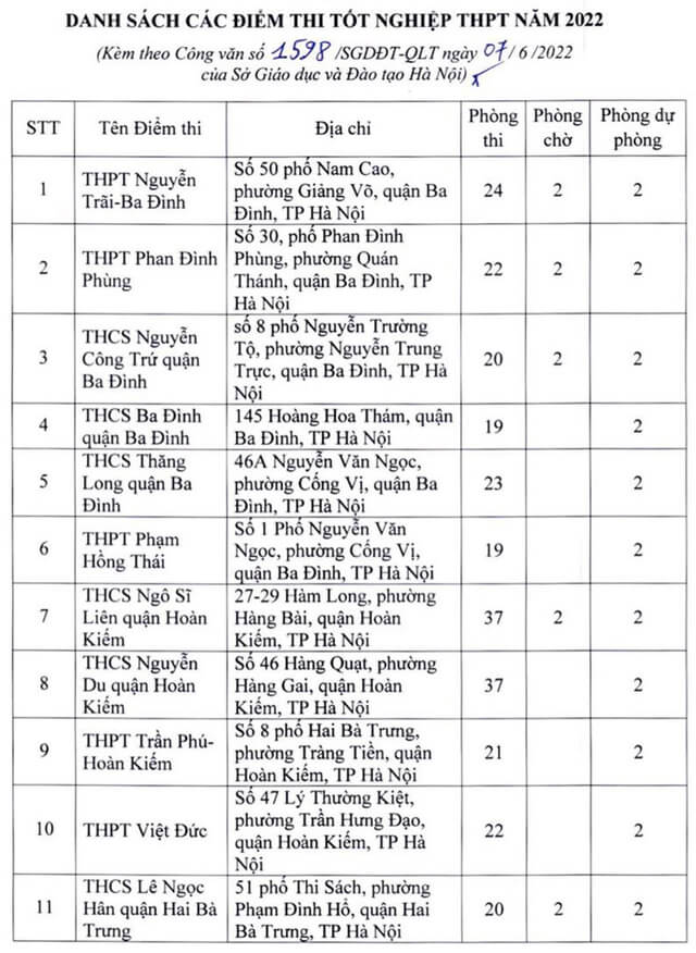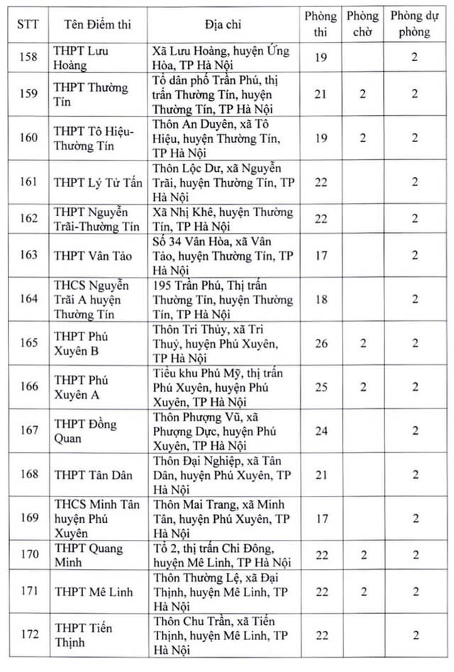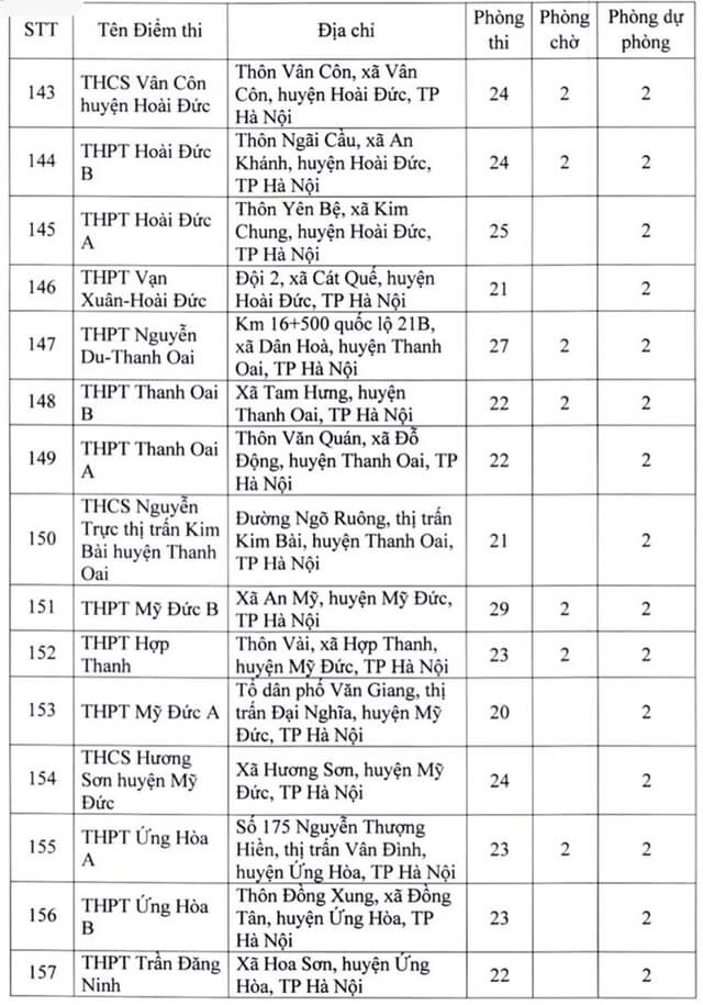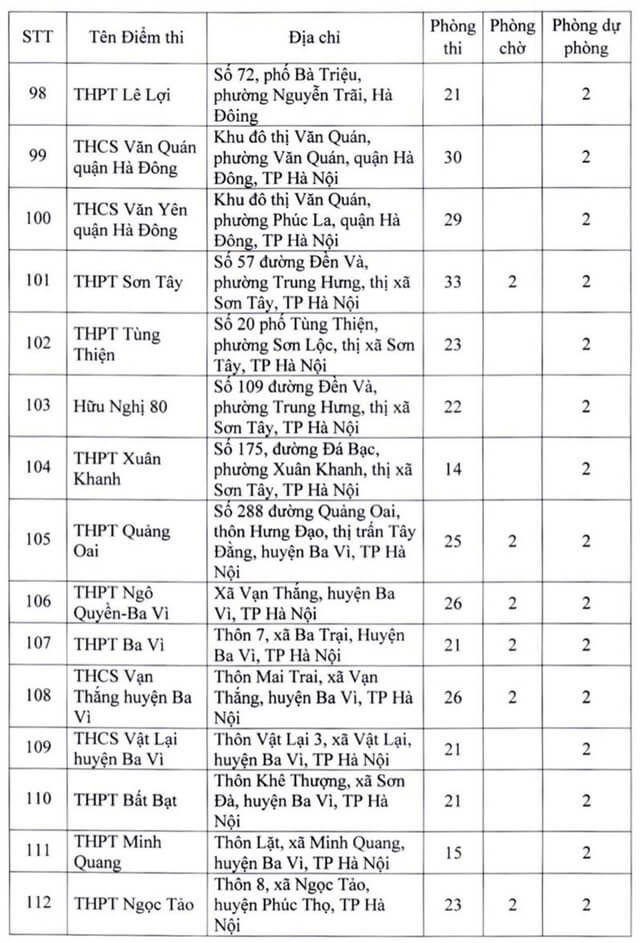 Theo đó, thành phố Hà Nội thành lập 181 điểm thi đặt tại các quận, huyện, thị xã. Ngoài số điểm thi chính thức, thành phố Hà Nội còn chuẩn bị các điểm thi dự phòng để chủ động ứng phó với dịch COVID-19 và các tình huống phát sinh. Năm 2022 Hà Nội là địa phương có số lượng thí sinh đăng ký dự thi chiếm gần 1/10 của cả nước, tương đương với gần 98.000 thí sinh. Vậy dưới đây là Danh sách 181 điểm thi tốt nghiệp THPT 2022 tại Hà Nội, mời các bạn cùng theo dõi tại đây.