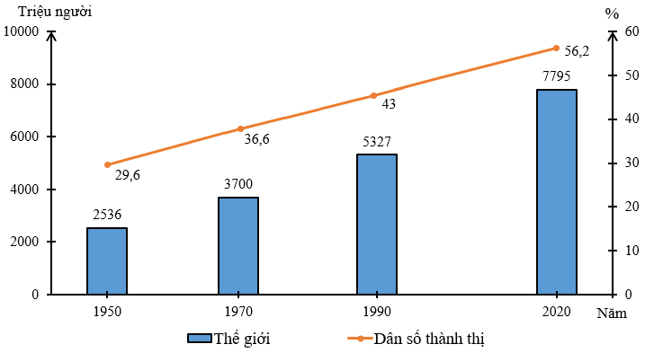 a) Tỉ lệ dân thành thị của thế giới giai đoạn 1950 - 2020 (Đơn vị: %)