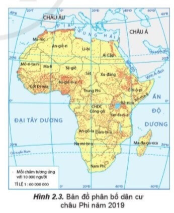 Đọc thông tin và quan sát hình 2.3, hãy cho biết phương pháp chấm điểm biểu hiện được các đối tượng địa lí có sự phân bố như thế nào.