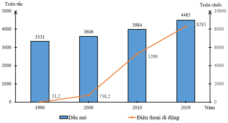 BIỂU ĐỒ THỂ HIỆN SẢN LƯỢNG KHAI THÁC DẦU MỎ VÀ SẢN XUẤT ĐIỆN THOẠI DI ĐỘNG TRÊN THẾ GIỚI GIAI ĐOẠN 1990 - 2019