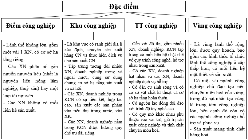 Hoàn thành sơ đồ theo mẫu sau để thể hiện đặc điểm của các hình thức tổ chức lãnh thổ công nghiệp