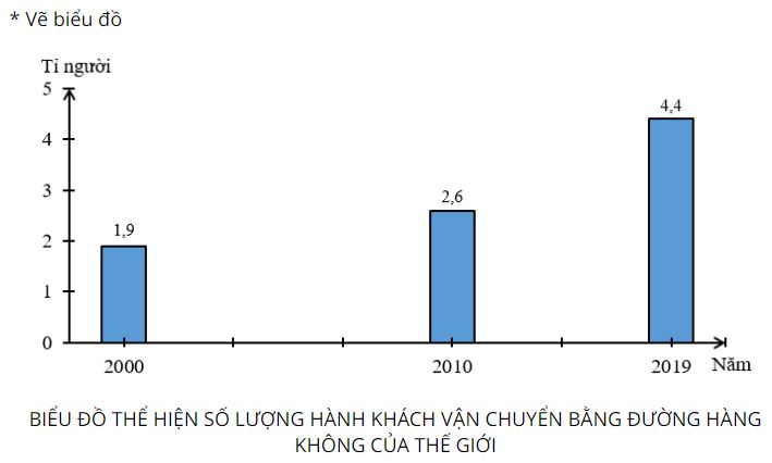Vẽ biểu đồ cột thể hiện số lượng hành khách vận chuyển bằng đường hàng không của thế giới theo bảng số liệu dưới đây. Nhận xét.