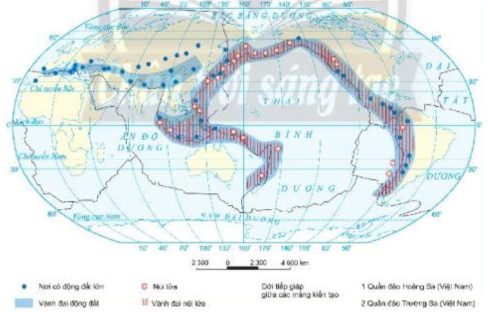 - Vành đai núi lửa: phía tây châu Mĩ, đông Đại Tây Dương, từ Địa Trung Hải qua Nam Á đến In-đô-nê-si-a, phía tây Thái Bình Dương.