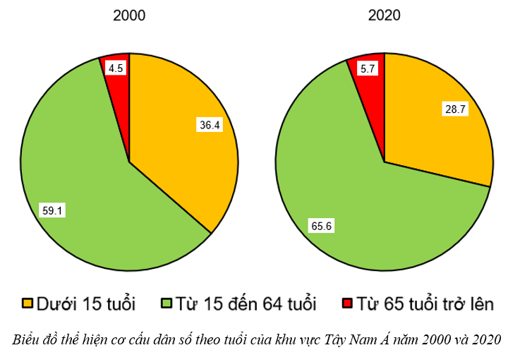 Dựa vào bảng 15.2 vẽ biểu đồ thể hiện cơ cấu dân số theo tuổi của khu vực Tây Nam Á năm 2000 và 2020. Nêu nhận xét.