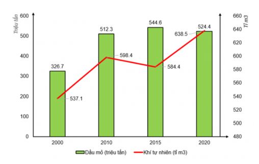 - Vẽ biểu đồ thể hiện sản lượng khai thác dầu mỏ và sản lượng khai thác khí tự nhiên của Liên bang Nga giai đoạn 2000 - 2020.