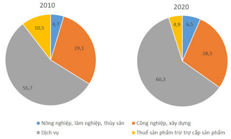 + Thuế sản phẩm trừ trợ cấp sản phẩm cũng giảm hơn một nửa từ 10,5% năm 2010 xuống chỉ còn 4,9% năm 2020, giảm 5,6%.