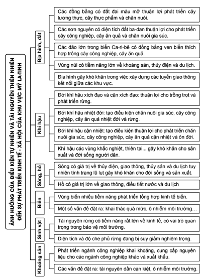 Lập sơ đồ thể hiện ảnh hưởng của điều kiện tự nhiên và tài nguyên thiên nhiên đến sự phát triển kinh tế - xã hội của khu vực Mỹ La-tinh
