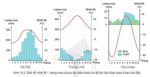 Dựa vào các biểu đỏ nhiệt độ – lượng mưa ở các địa điểm Hà Nội (Việt Nam), Pa-lec-mô (T-ta-li-a), Hon-man (Ca-na-đa) đưới đây, hãy: