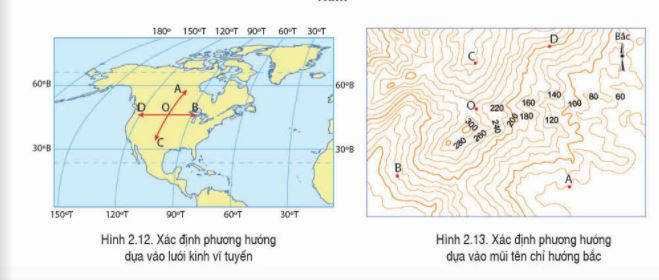 Quan sát hình 2.12 và hình 2.13, hãy cho biết các hướng của OA, OB, OC và OD có trong mỗi hình.