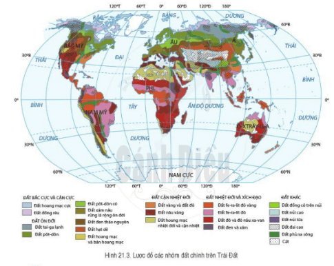 Kể tên và xách định trên hình 21.3 một số nhóm đất chính ở vùng cận nhiệt đới.