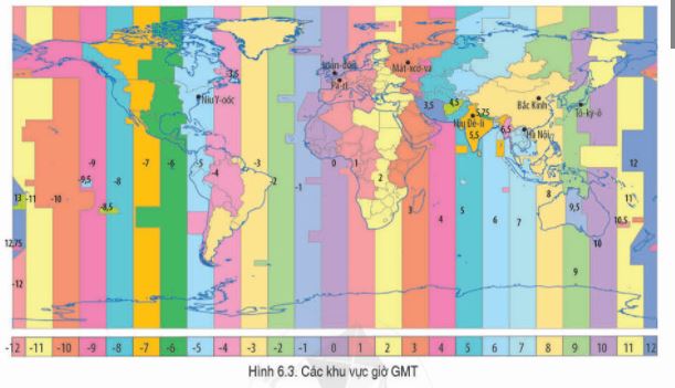 Quan sát hình 6.2 và xác định: Việt Nam nằm ở khu vực giờ số mấy? Kinh tuyến nào là kinh tuyến trung tâm để xác định khu vực giờ của Việt Nam?