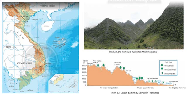 Câu hỏi trang 100 Địa Lí 8: Dựa vào các hình 2.1, 2.2, 2.3 và thông tin trong bài, em hãy trình bày một trong những đặc điểm chủ yếu của địa hình Việt Nam.