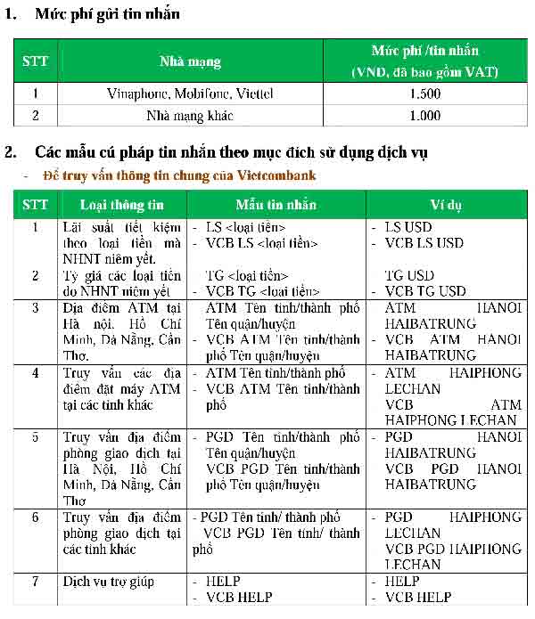 - Đối với các Khách hàng đã đăng ký dịch vụ nhắn tin chủ động trước ngày 01/09/2010 theo mức phí cũ 15.000 đồng/20 tin nhắn và vẫn chưa sử dụng hết số lượng tin nhắn chủ động đã kích hoạt dịch vụ, Vietcombank sẽ duy trì việc gửi tin nhắn chủ động cho Khách hàng cho đến khi Khách hàng nhận đủ tin nhắn đã kích hoạt.