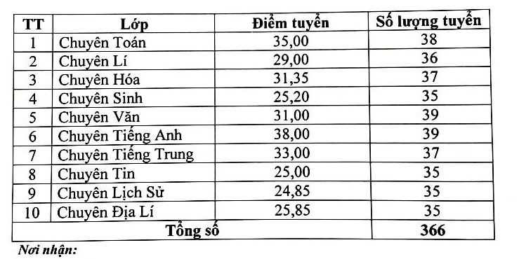 Theo kế hoạch, chỉ tiêu tuyển sinh năm học này của nhà trường là 350 em. Tuy nhiên, có 366 thí sinh đỗ vào trường, với 10 môn chuyên. Số điểm tuyển cao nhất là môn chuyên Tiếng Anh (38 điểm). Mỗi lớp chuyên tuyển từ 35 - 39 học sinh.