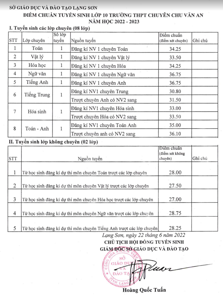 Điểm chuẩn lớp 10 năm 2022 Lạng Sơn